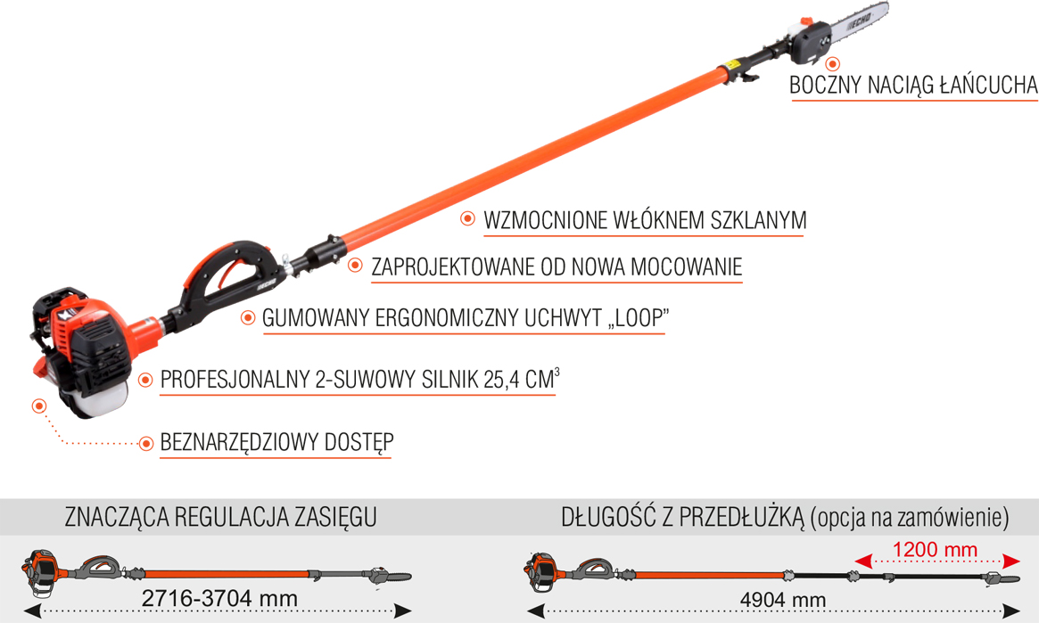 Długość pilarki na wysięgniku Echo PPT-2620ES to 2716 mm, którą możemy powiększyć do długości 3704 mm. Natomiast z opcjonalną przedłużką długość pilarki na wysięgniku wzrasta do 4904 mm.